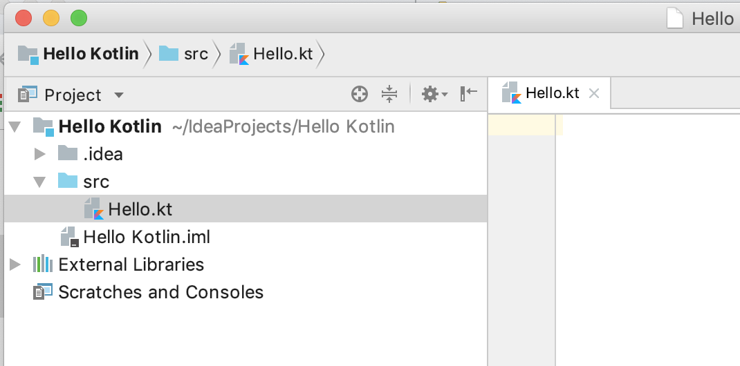 现在在 src 目录下有一个名为 Hello.kt 的文件了。