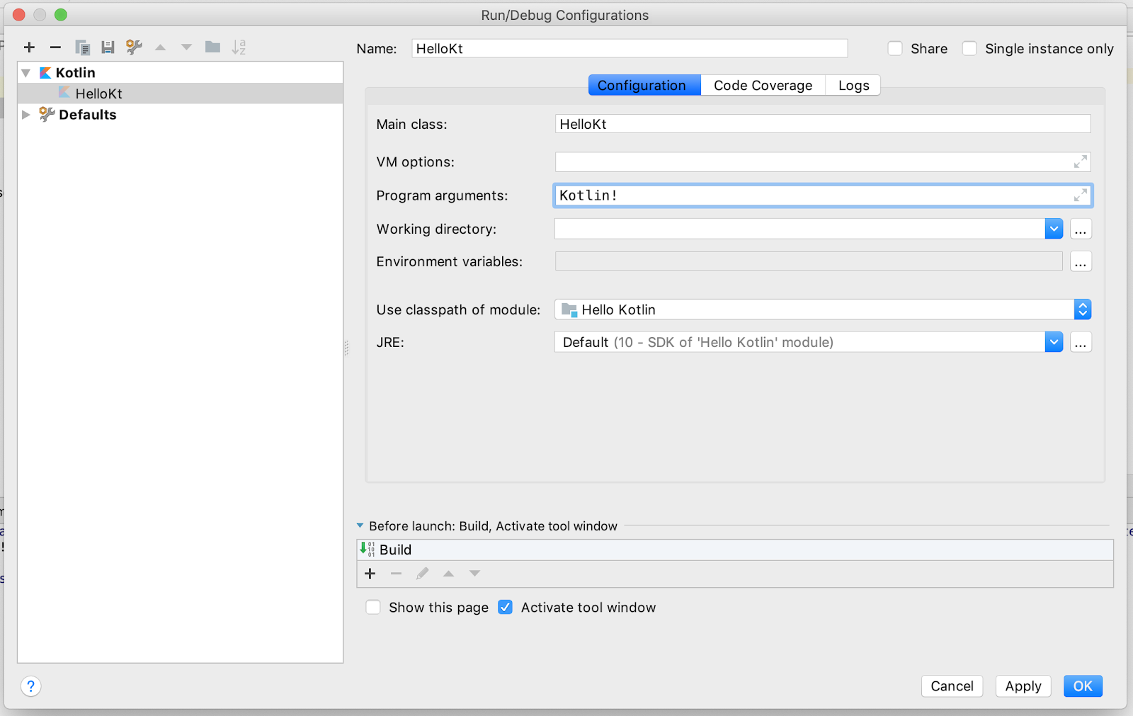 2. Program arguments 字段中输入 Kotlin!